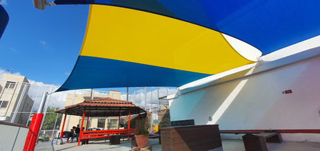 We recently designed, manufactured, and installed brightly coloured shade sails for a secondary school’s outdoor seating area, complete with colour-coordinated post protectors for added safety and value. At the Angel’s Sun Nest Kindergarten, American Academy Private Limassol, we created two tailored shading solutions: four vibrant bespoke shade sails covering the play equipment, and a Desert Sand shade net installation that blends seamlessly with the surroundings while shading the balcony area.
